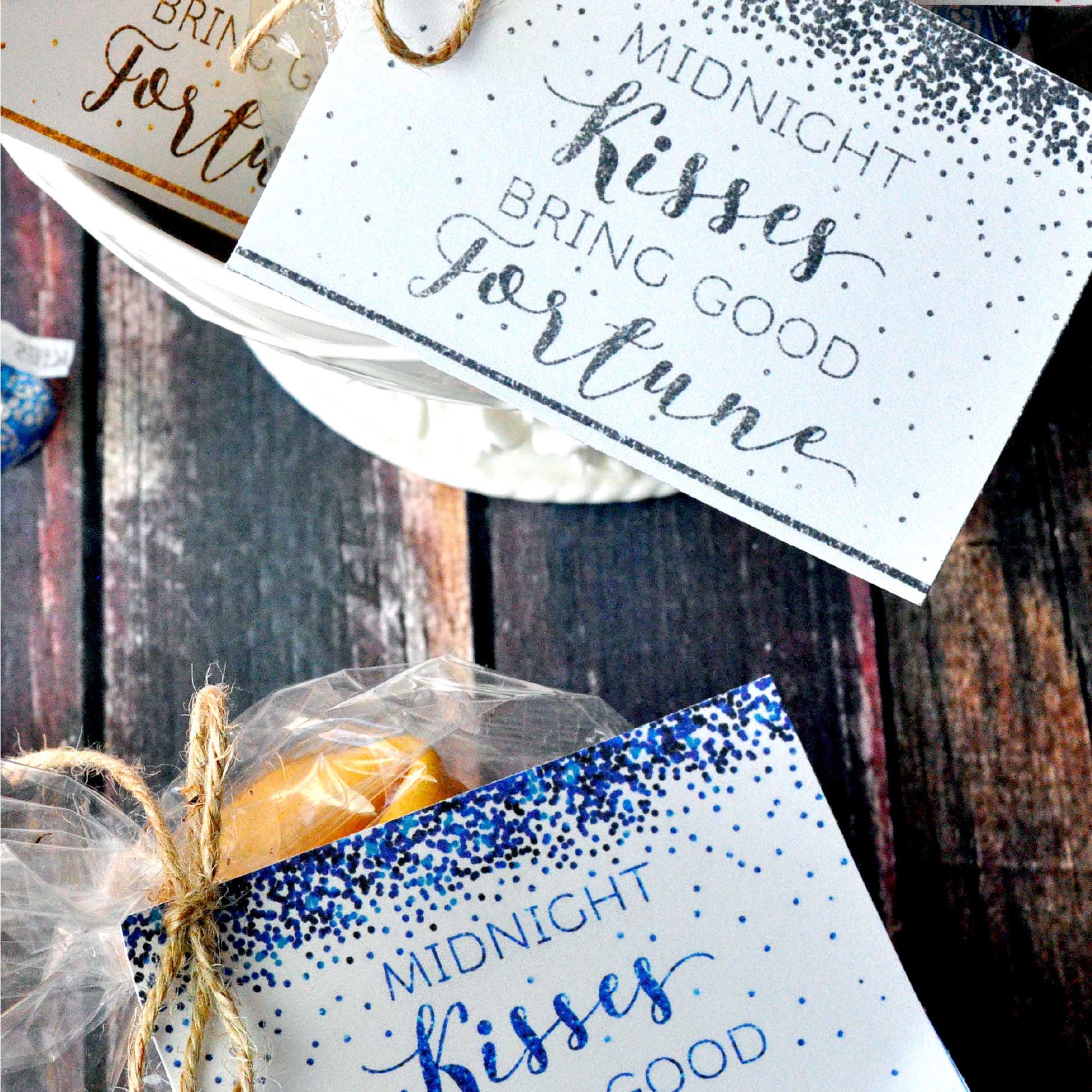 ⭐️ “Midnight Kisses Bring Good Fortune Tags”: Fill a bag with kisses and fortune cookies to give to all your party guests. When the clock strikes midnight,